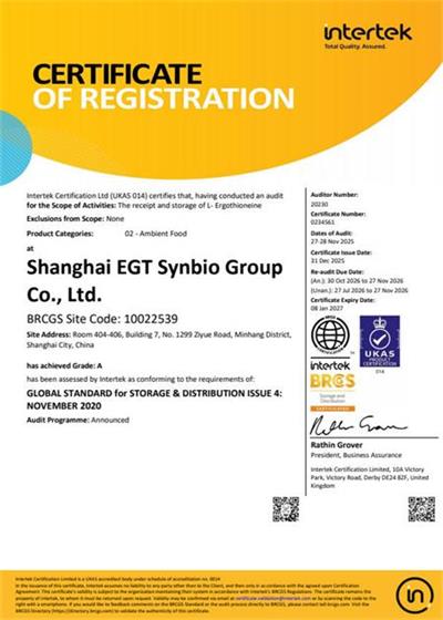 祝贺上海麦角硫因科技有限公司2025年顺利通过BRC认证并取得A级证书